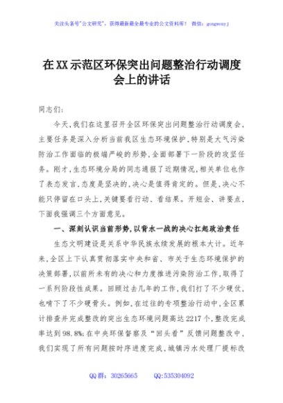 / 在XX示范区环保突出问题整治行动调度会上的讲话