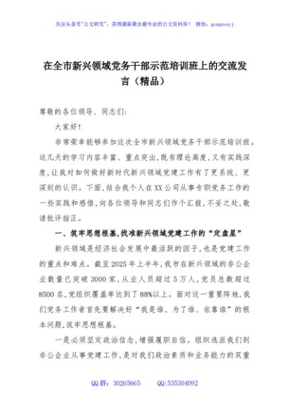 / 在全市新兴领域党务干部示范培训班上的交流发言(精品)