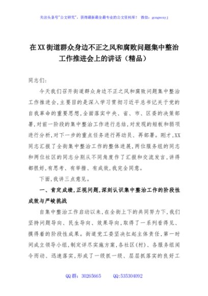 / 在XX街道群众身边不正之风和腐败问题集中整治工作推进会上的讲话(精品)