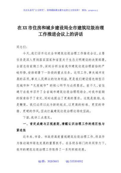 / 在XX市住房和城乡建设局全市建筑垃圾治理工作推进会议上的讲话