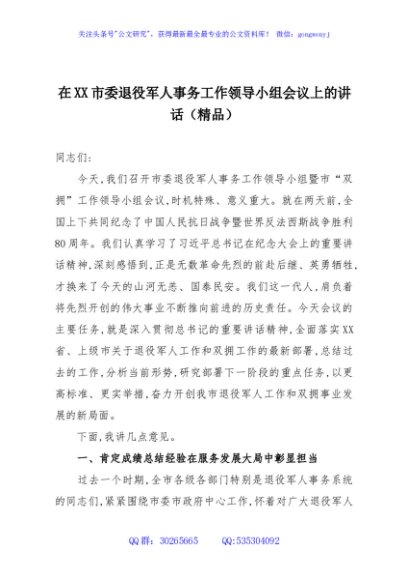 / 在XX市委退役军人事务工作领导小组会议上的讲话(精品)