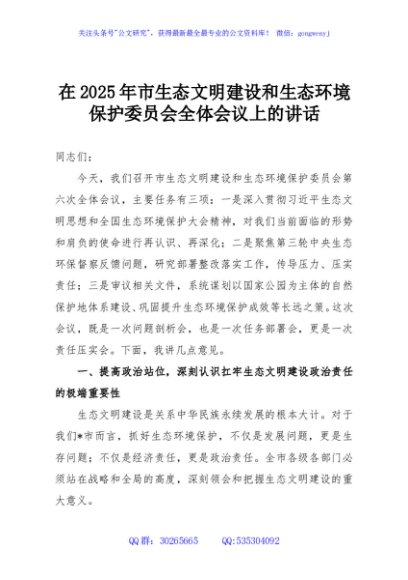 / 在2025年市生态文明建设和生态环境保护委员会全体会议上的讲话