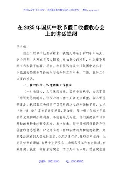 / 在2025年国庆中秋节假日收假收心会上的讲话提纲