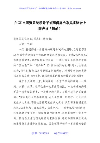 / 在XX市国资系统领导干部配偶廉洁家风座谈会上的讲话(精品)