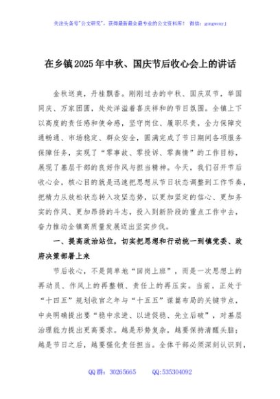 / 在乡镇2025年中秋、国庆节后收心会上的讲话