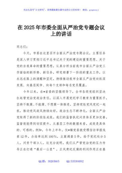 / 在2025年市委全面从严治党专题会议上的讲话