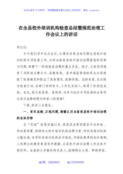 / 在全县校外培训机构检查总结暨规范治理工作会议上的讲话