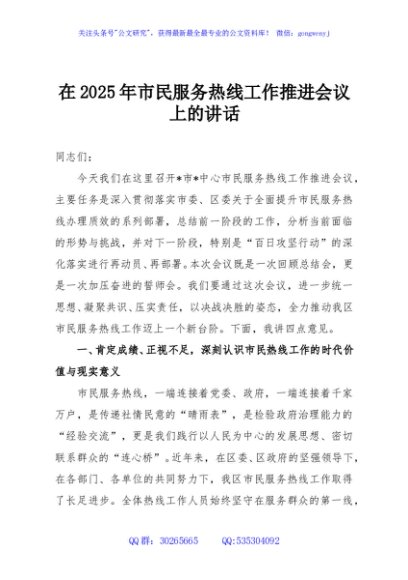 / 在2025年市民服务热线工作推进会议上的讲话