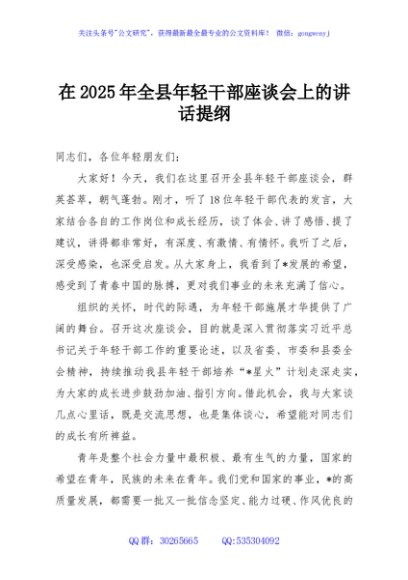 / 在2025年全县年轻干部座谈会上的讲话提纲