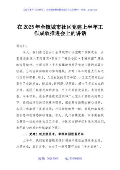 / 在2025年全镇城市社区党建上半年工作成效推进会上的讲话