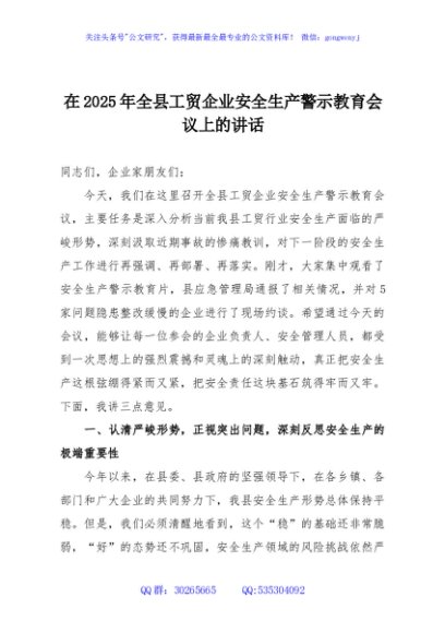 / 在2025年全县工贸企业安全生产警示教育会议上的讲话