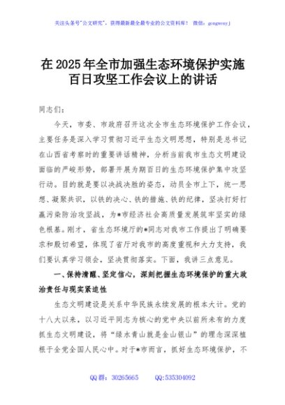 / 在2025年全市加强生态环境保护实施百日攻坚工作会议上的讲话