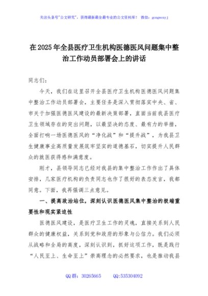 / 在2025年全县医疗卫生机构医德医风问题集中整治工作动员部署会上的讲话