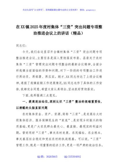 / 在XX镇2025年度村集体“三资”突出问题专项整治推进会议上的讲话(精品)