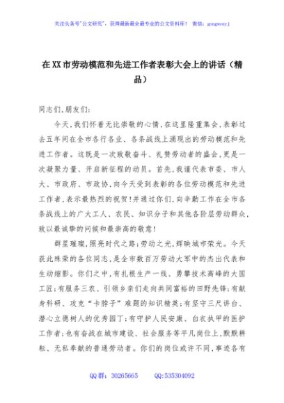 / 在XX市劳动模范和先进工作者表彰大会上的讲话(精品)