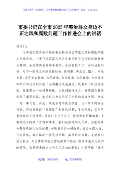 / 市委书记在全市2025年整治群众身边不正之风和腐败问题工作推进会上的讲话