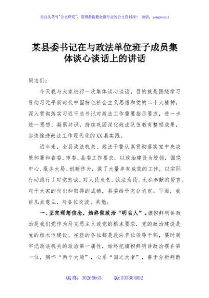 / 某县委书记在与政法单位班子成员集体谈心谈话上的讲话