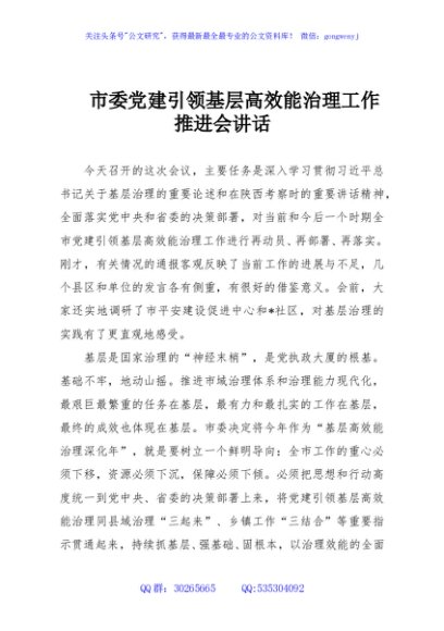 / 市委党建引领基层高效能治理工作推进会讲话