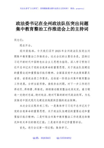 / 政法委书记在全州政法队伍突出问题集中教育整治工作推进会上的主持词