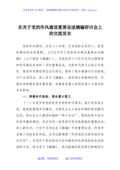 / 在关于党的作风建设重要论述摘编研讨会上的交流发言