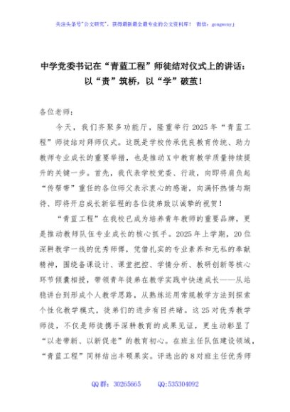 / 中学党委书记在“青蓝工程”师徒结对仪式上的讲话:以“责”筑桥,以“学”破茧!