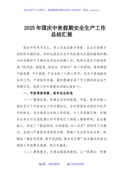 / 2025年国庆中秋假期安全生产工作总结汇报