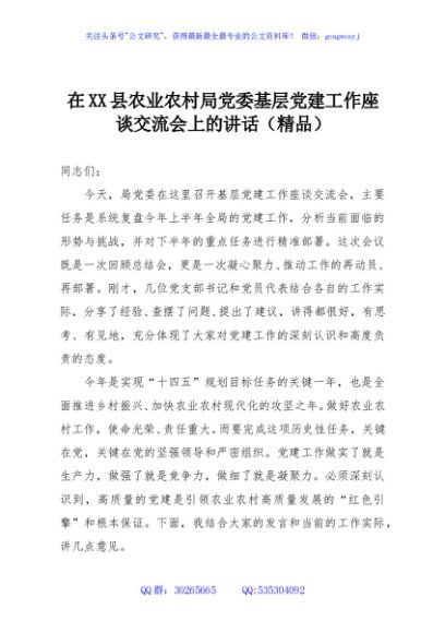 / 在XX县农业农村局党委基层党建工作座谈交流会上的讲话(精品)