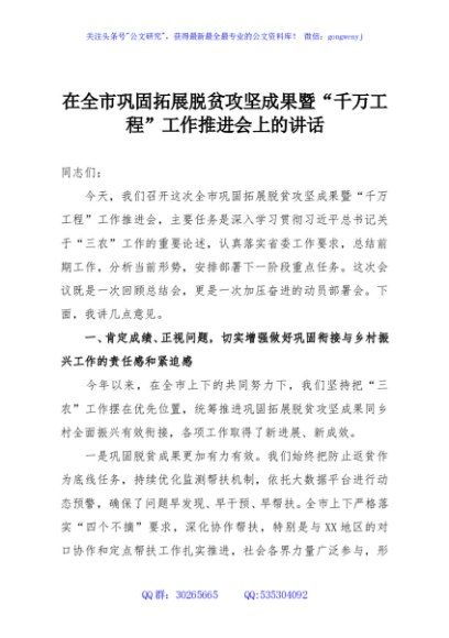 / 在全市巩固拓展脱贫攻坚成果暨“千万工程”工作推进会上的讲话