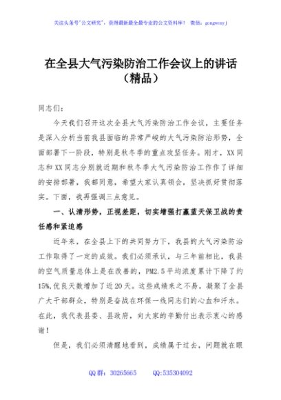 / 在全县大气污染防治工作会议上的讲话(精品)