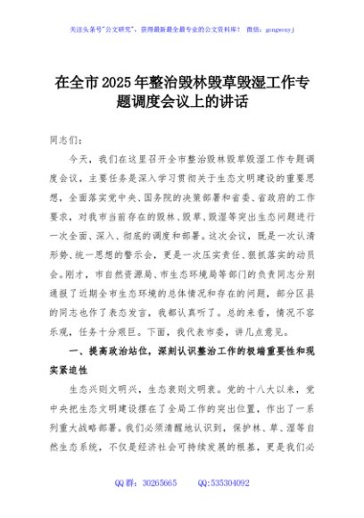 / 在全市2025年整治毁林毁草毁湿工作专题调度会议上的讲话