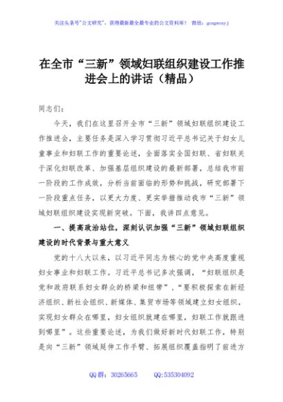 / 在全市“三新”领域妇联组织建设工作推进会上的讲话(精品)