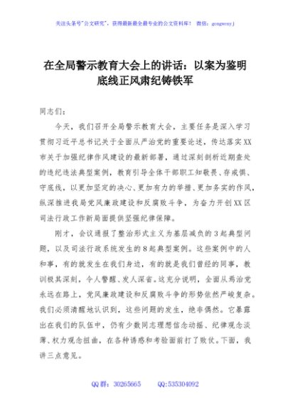 / 在全局警示教育大会上的讲话:以案为鉴明底线正风肃纪铸铁军
