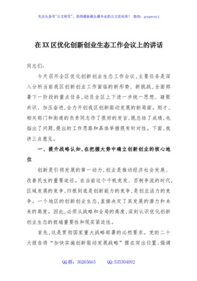 / 在XX区优化创新创业生态工作会议上的讲话