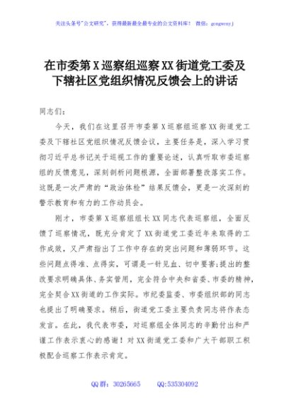 / 在市委第X巡察组巡察XX街道党工委及下辖社区党组织情况反馈会上的讲话