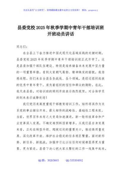 / 县委党校2025年秋季学期中青年干部培训班开班动员讲话
