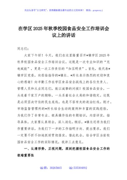 / 在学区2025年秋季校园食品安全工作培训会议上的讲话