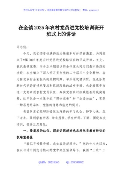 / 在全镇2025年农村党员进党校培训班开班式上的讲话