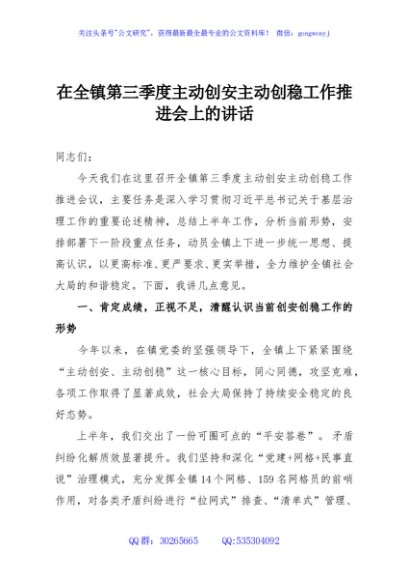 / 在全镇第三季度主动创安主动创稳工作推进会上的讲话
