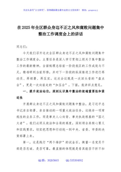 / 在2025年全区群众身边不正之风和腐败问题集中整治工作调度会上的讲话