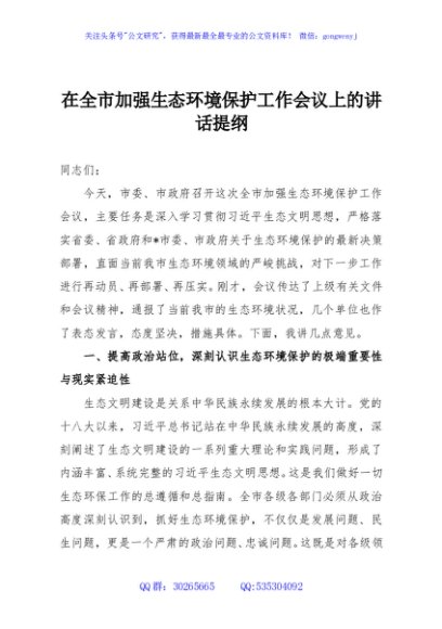 / 在全市加强生态环境保护工作会议上的讲话提纲