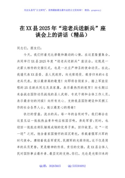 / 在XX县2025年“迎老兵送新兵”座谈会上的讲话(精品)