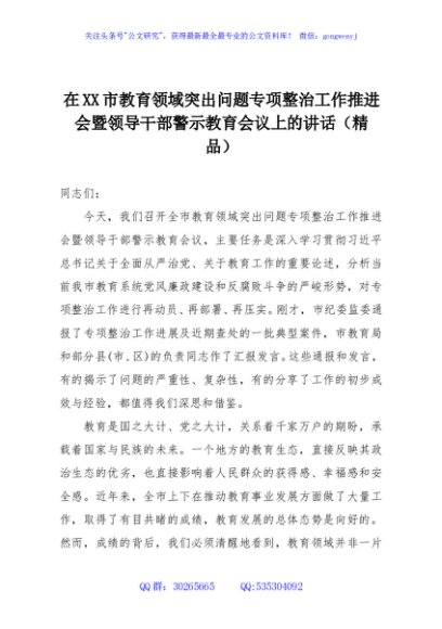 / 在XX市教育领域突出问题专项整治工作推进会暨领导干部警示教育会议上的讲话(精品)