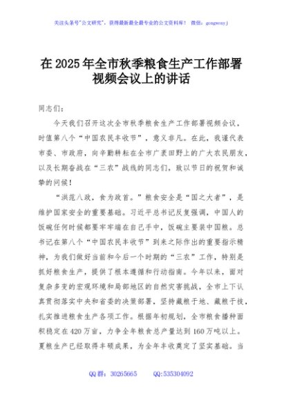 / 在2025年全市秋季粮食生产工作部署视频会议上的讲话