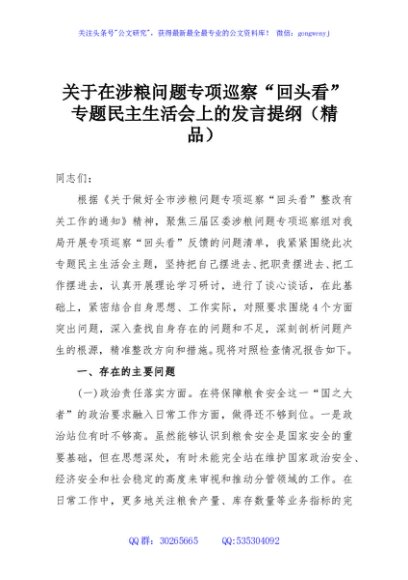 / 关于在涉粮问题专项巡察“回头看”专题民主生活会上的发言提纲(精品)