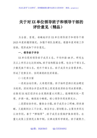 / 关于对XX单位领导班子和领导干部的评价意见(精品)
