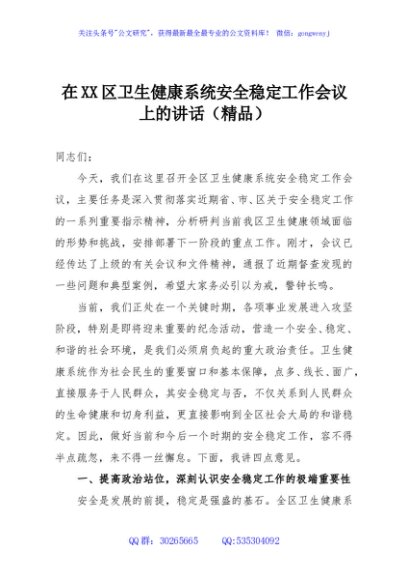 / 在XX区卫生健康系统安全稳定工作会议上的讲话(精品)