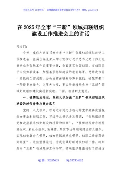 / 在2025年全市“三新”领域妇联组织建设工作推进会上的讲话