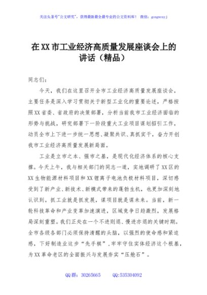 / 在XX市工业经济高质量发展座谈会上的讲话(精品)