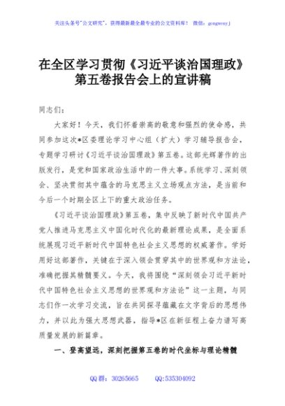 / 在全区学习贯彻《习近平谈治国理政》第五卷报告会上的宣讲稿