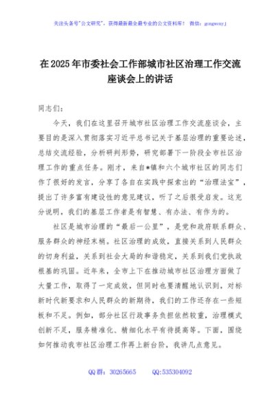 / 在2025年市委社会工作部城市社区治理工作交流座谈会上的讲话